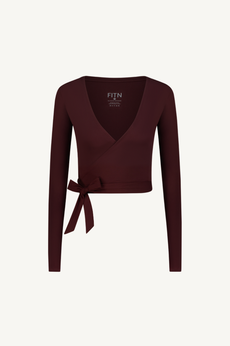 Designed with a soft V-neckline and adjustable wrap tie, our plum toned wrap over top is anything but basic. It features long thumbhole sleeves which provides extra warmth and versatility, making it perfect for layering over your favorite active sets or styling beyond the studio.